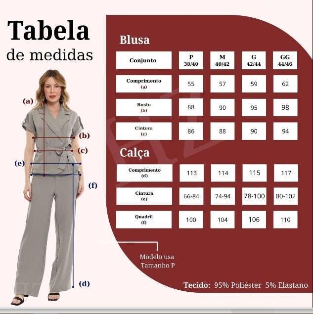 A blusa blazer sem manga vem com botões frontais e cinto faixa para você ajustar do jeitinho que gosta — conforto com estilo, porque ninguém merece aperto! A calça pantalona, com caimento reto e elegante, tem elástico e passador para cinto, garantindo que tudo fique no lugar o dia todo.