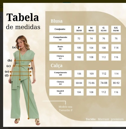 A blusa apresenta um decote em V moderno e uma amarração lateral que ajusta e modela com delicadeza, enquanto a calça pantalona oferece conforto com seu elástico na cintura e caimento impecável. Confeccionado em tecido Marrant Premium (90% viscose/10% poliéster), leve, fresco e resistente, para você se sentir maravilhosa em qualquer ocasião.