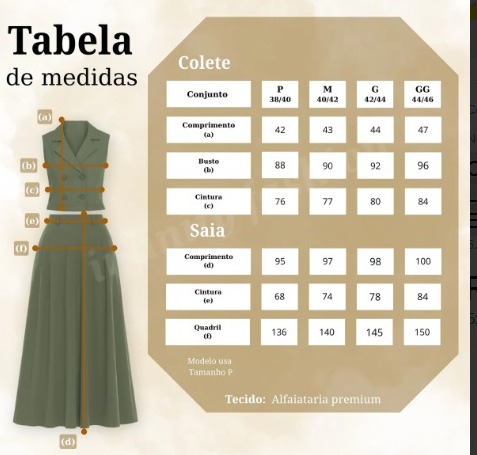 Disponível nos tamanhos P ao GG, este conjunto valoriza a silhueta com medidas pensadas para seu conforto e elegância, garantindo um look impecável e cheio de estilo.
