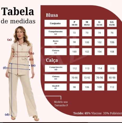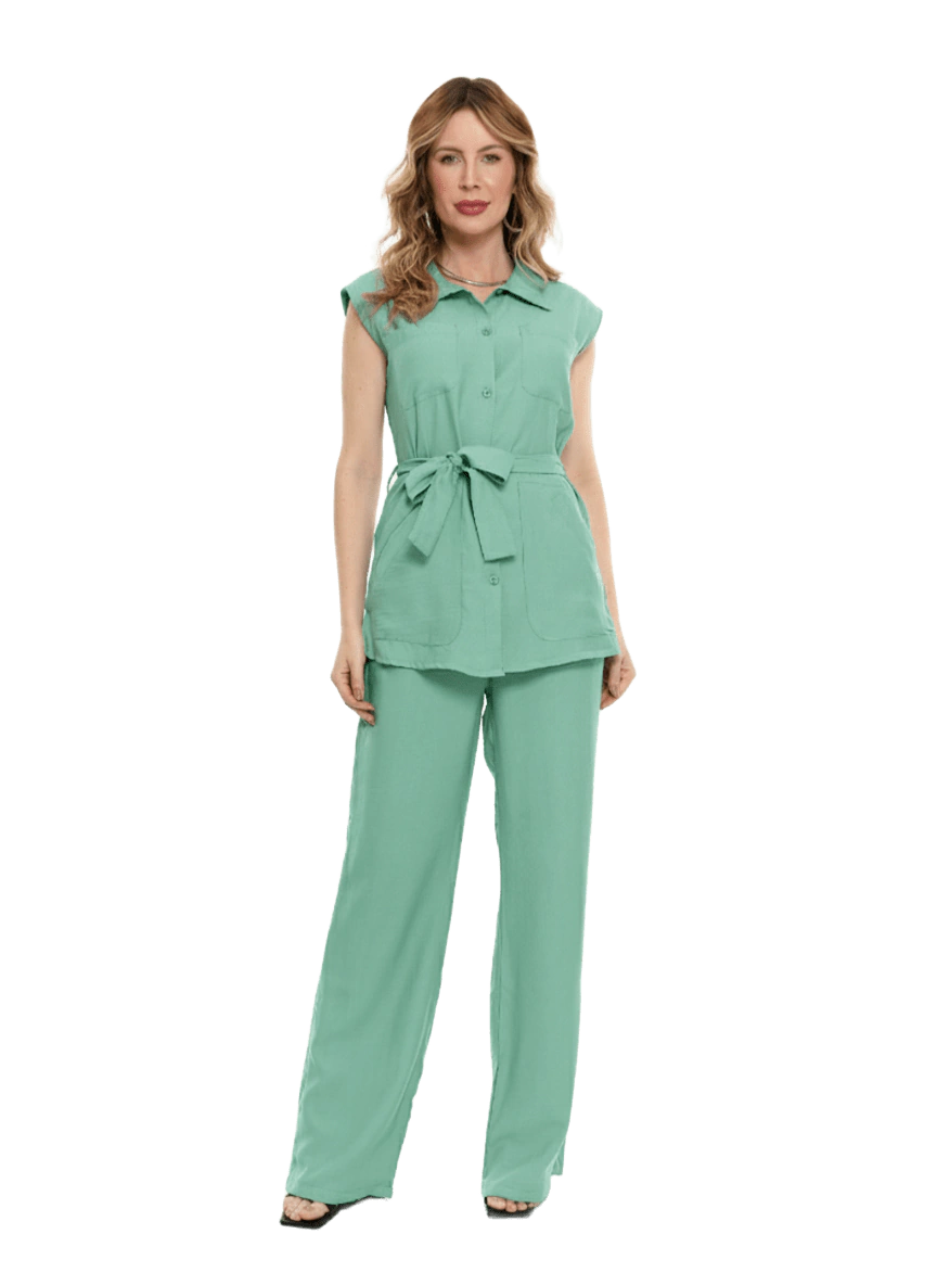Este conjunto é tipo aquele amigo que já chega combinado e pronto para te salvar: blusa sem mangas com botões frontais e faixa para amarração, junto com calça reta estilo alfaiataria, bolsos para guardar segredos e um elástico que abraça a cintura na medida certa.